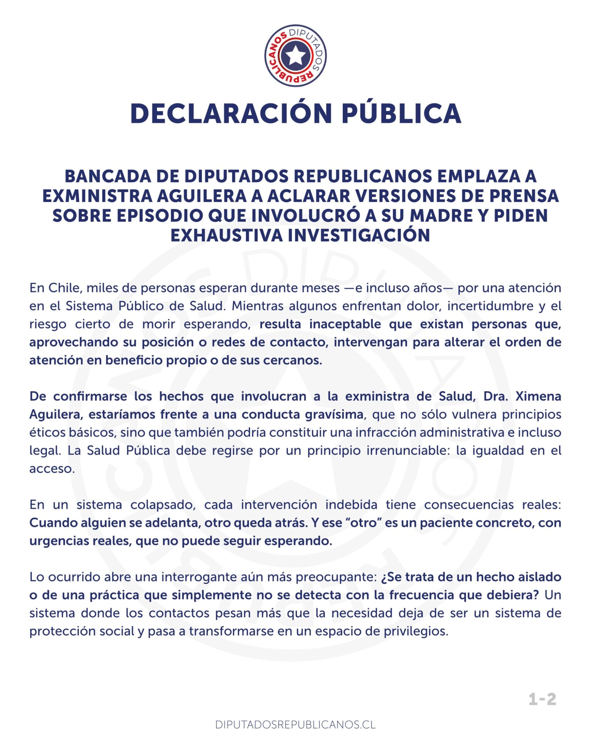 De confirmarse los hechos que involucran a la exministra de Salud, Dra. Ximena Aguilera, estaríamos frente a una conducta gravísima, que no sólo vulnera principios éticos básicos, sino que también podría constituir una infracción administrativa e incluso legal. La Salud Pública debe regirse por un principio irrenunciable: la igualdad en el acceso.